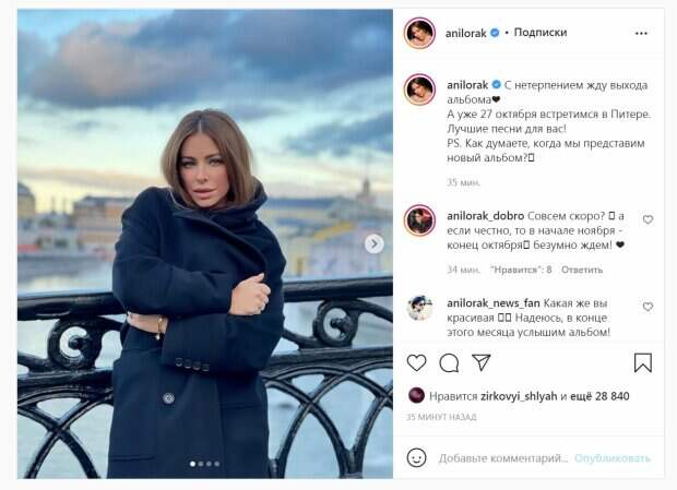 "С нетерпением жду выхода альбома ❤️ А уже 27 октября встретимся в Питере. Лучшие песни для вас! PS. Как думаете, когда мы представим новый альбом?⬇️", - откровенно написала Лорак. Пост звезда подкрепила снимками в безразмерном пальто. За 35 минут пост собрал почти 30 тысяч лайков и много комментариев: "Совсем скоро?