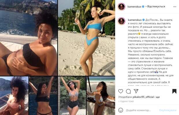 И все это в откровенных купальниках. На первой части снимков Настя запечатлена на отдыхе, она позирует в разных купальниках. При этом хорошо видно ее складки на животе и пышны бока. Многие помнят певицу именно такой, но она никогда не показывала себя в этом весе в откровенных купальниках. На второй части снимков Каменских уже здорово похудела и без стеснения демонстрирует фигуру в таких же соблазнительных купальниках. В подписи к публикации Настя рассказала о своем похудении и о том, что нужно любить себя в любом весе. "Вы знаете, я много лет стеснялась выставлять эти фото. И раньше никогда бы не показала их. Но... реалити так реалити. Я всегда максимально открыта с вами, и хоть я долго стеснялась и переживала, и очень часто не воспринимала себя, сейчас я пришла к тому что мы должны. Мы просто обязаны любить себя! Неважно, сколько килограмм, неважно, как мы выглядим. Главное – это стремление и желание становиться лучше и воспринимать саму себя", - откровенно написала Каменских. Поклонники тут же принялись обсуждать новую публикацию звезды. "Самый сок", "В любом весе красивая", "Пышка", "А какие параметры были до похудения", "Очень красивая в любом весе", "Мне до нравится больше". Напомним, популярная певица Настя Каменских после семейного горя распродает дорогие сердцу вещи: "Приглашаю...". Как сообщала Politeka, счастливая певица Настя Каменских нежно прижалась к возлюбленному Потапу: "Мимишность зашкаливает". Также Politeka писала, Алексей Потапенко неожиданно покинул Украину с самым родным человеком, оставив любимую жену Настю Каменских одну: "Рад видеть".