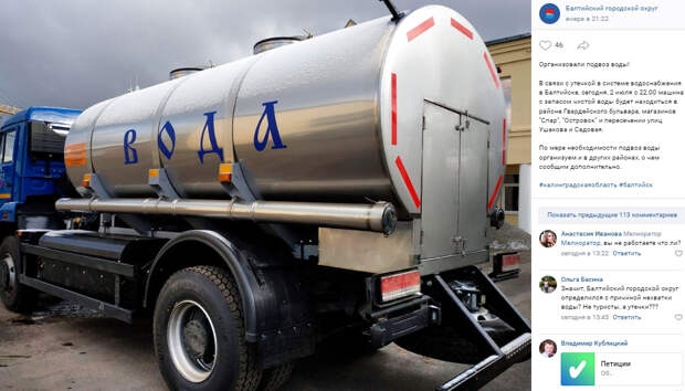 Отмечалось, что «наряду с отказом скважины на Комендатурской линии водоснабжения и повышенным разбором воды, на одном из объектов МО РФ произошла серьезная утечка чистой воды, что привело к значительному снижению уровня в резервуарах чистой воды, предназначенных для снабжения города». Вода была отключена в ночное время с целью сохранения наполнения системы. Сообщалось о мониторинге на предмет утечек и плановых работах на скважине и намерении восстановить нормальную подачу воды в системе до конца недели. 29 июня жители пожаловались на отсутствие воды, на что администрация Балтийского городского округа сообщила в соцсетях, что причина в жаре, из-за которой в июне был повышенный забор воды для полива, и городские сети потеряли большое количество воды. Эта ситуация вызывает необходимость отключать воду ночью. 1 июля администрация Балтийского округа повторила, что в связи с большим наплывом отдыхающих и повышенным водоразбором город испытывает нехватку воды. С целью сохранения наполнения системы сотрудники предприятия «Балтвода» принимали экстренные меры, регулировали подачу воду и проводили мониторинг на предмет возможных утечек на водоводах города. 2 июля администрация сообщила об отключении во всем городе с 14:00 до 17:00 воды для проведения работ по устранению утечки. Жители сообщали, что напор воды пропал с самого утра. Днем администрация написала в соцсетях, что в работах задействованы 14 человек от МУП «Балтвода» и 5 человек от ФГБУ «ЦЖКУ» МО РФ. Для жителей организовали подвоз воды в цистернах. Отмечалось, что устранены утечки на улицах Гагарина и Кузнецова, на шоссе Морской пехоты, однако все равно ночью воду нужно отключить. Предупредили, что утром могут отключить воду в районе улицы Красной Армии, улицы Кузнецова, Морского бульвара, улицы Головко, Русской набережной. 3 июля администрация Балтийского городского округа сообщала, что с утра вновь организован подвоз чистой воды, а работы по поиску утечки продолжаются. «Продолжаем вести работы по обнаружению утечки. В помощь подключился Калининградский „Водоканал“», — написала пресс-служба администрации утром 3 июля. Чуть позже появилось сообщение об обнаружении утечки воды на улице Гагарина на объекте ремонта дороги из-за разрыва трубы. Для устранения утечки понадобилось отключить воду в городе. Комитет городского хозяйства Балтийска назвал ситуацию «сложнейшей». При этом продолжаются работы по поиску утечек совместно со специалистами диспетчерской службы диагностики калининградского Водоканала. «Для выявления утечки и мониторинга водопроводных сетей временно прекратили подачу воды по районам города до 18:00», — написала пресс-служба администрации вечером. Под данным сообщениям жители в соцсетях сообщают, что и после этого времени воду не дали.