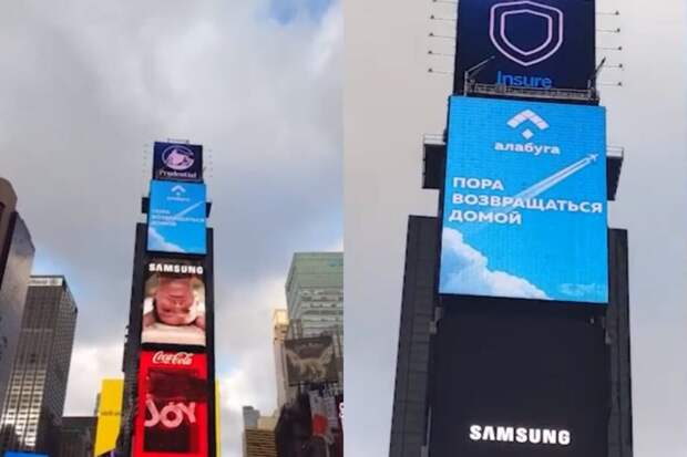 Реклама гласит: «Пора возвращаться домой». Pr Scr ntv.ru Особая экономическая зона «Алабуга» из Татарстана разместила рекламу на Таймс-сквер в Нью-Йорке с призывом к эмигрировавшим российским специалистам в области IT вернуться домой. Светящейся баннер заметили на главной площади Манхеттена. На нём изображён логотип «Алабуги» и надпись: «Пора возвращаться домой».
