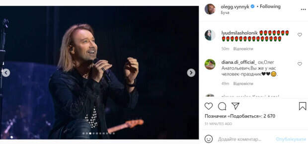Винник на снимках, как всегда выглядит прекрасно. «Люблю праздновать вместе с вами ваши знаменательные даты! Спасибо за феерический прием! Вся Буча на Юбилейном. Еще раз поздравляю с Днем рождения!», - подписал фото артист. В комментариях поклонники стали делиться впечатлениями о концерте. «Там, где вы, всегда праздник», «Вы человек праздник! Даже сильный дождь пройдет от Вашего голоса. Зажгли Бучу по полной!», «Вся Буча запомнит этот концерт, спасибо тебе большое за эти эмоции», «Олег Анатольевич, Вы самый лучший! И с праздником поздравили, и девушек самыми счастливыми сделали», «Молодец, феерично!», «Ох, Олег Анатольевич, вы же у нас человек-праздник», - пишут пользователи сети. Напомним, что поклонницы Олега Винника "атаковали" его машину: "Пожалуйста...". Как сообщала Politeka, Олег Винник во всем черном поставил на уши город под Киевом: " Не забывайте…". Также Politeka писала, что у Олега Винника "большая любовь" с замужней певицей: "Делаем ребенка".