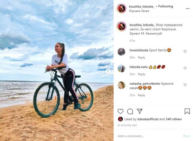 На первом снимке Ксения Лобода запечатлена верхом на велосипеде, она облокотилась руками о руль, оперлась ногой о песок и с радостной улыбкой смотрит вдаль. Для велопрогулки красавица надела обтягивающие спортивные штаны и белую футболку, а волосы собрала в тугой хвост на затылке. На втором фото Ксения прижалась к своему мужу Артему, с которым сыграла свадьбу в июле этого года. Мужчина одет в зеленую футболку с ярким рисунком и серые шорты, он придерживает рукой велосипед, чтобы тот не упал. "Мир - прекрасное место. За него стоит бороться. Эрнест М. Хемингуэй", - процитировала писателя Ксения и заслужила много лайков, даже Светлана Лобода не удержалась и поставила отметку "Мне нравится". Недавно Ксения отметила 28-й день рождения. Знаменитая сестра поздравила девушку с праздником и даже поделилась совместным фото. На нем Светлана запечатлена в коротких джинсовых шортах и черном корсете с белой отделкой. Напомним, что младшая сестра Лободы в необычном топе показала свои формы во всей красе: можно только позавидовать. Как сообщала Politeka, Лобода в слишком тесном корсете устроила жаркие танцы перед камерой: "Будто снова 20". Также Politeka писала, что сестра Лободы в золотом платье затмила певицу, Брежнева не устояла: "Огонь, Светлана отдыхает! ".