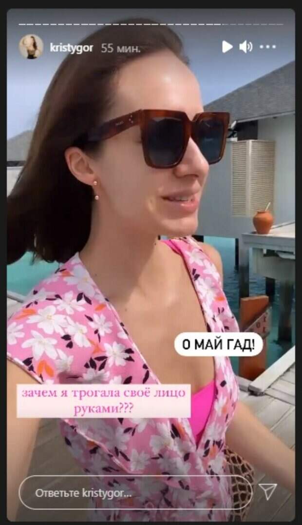 Девушка сразу предупредила, почему сегодня будет показывать себя только в правый профиль. "О май гад! Зачем я трогала свое лицо руками? Я поворачиваюсь к вам вправо, потому что у меня на лице три прыща, которые я, естественно, потрогала руками и теперь там не очень красиво...", - честно призналась Кристина. Далее жена Остапчука рассказала о прелестях жизни на водной вилле и о том, что они с мужем все же хотят переселиться в другое место, объяснив причину. "В виллах на воде есть свой определенный кайф: во-первых, небо, звезды, во-вторых, сразу спуск в воду и отсутствие живности, а в третьих, я очень сегодня страшко... (смеется). Ладно, шучу, на самом деле", - сообщила Кристина и добавила, - "Сегодня у нас день переселения с водной виллы - так что по этому всему я буду очень скучать - на виллу на песке. Мы решили попробовать пожить и там, так как никогда не были на Мальдивах. Самое удивительное, в нашем отеле виллы на воде дешевле, чем на песке, хотя обычно все наоборот". Ранее мы рассказывали, как Остапчук с женой показали, какая "опасность" может подстерегать украинского туриста в райском уголке. В частности, Владимир заснял маленьких акул совсем рядом с виллами. Напомним, стройная жена Остапчука сверкнула идеальными формами на Мальдивах, горячее фото: "Крис, ты лучшая". Как сообщала Politeka, Остапчук ошеломил кадрами с акулами и летучими собаками, отпуск становится опасным. Также Politeka писала, что бесстыжий Остапчук посветил своим "фруктом", полностью раздевшись на отдыхе: "Полякова обзавидуется".