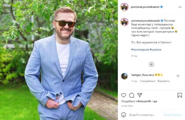 Оказалось, что недавно Александра поругали в комментариях за фото в полицейской форме, так что теперь он решил сфотографироваться в совершенно другом образе. На новом снимке артист запечатлен среди густой летней зелени, сложив руки на поясе и мило улыбаясь. Перед камерой завидный холостяк Пономарев появился в модном светло-синем костюме, под пиджаком которого у него белый свитер, а свой образ он дополнил симпатичными солнцезащитными очками. В подпсии к фотографии Александр написал: "Почитал Ваши комментарии в предыдущем полицейском посту – прозрел, на всякий случай переоделся. Хорошего воскресенья! П.с. Всех журналистов с праздником!". Пользователи тут же взялись комментировать новый образ шоумена: "Хорошего воскресенья! Красавец!", "В любой одежде – самый лучший", "Красавец", "Хорошей воскресенья, хорошего настроения", "Так лучше", "В любом образе, улыбка неизменно красивая", "Так Вам лучше". Напомним, Александр Пономарев в особый день поделился с украинцами своей болью: "Помним, любим! Царство Небесное". Как сообщала Politeka, Злата Огневич решила открыться, что теперь ее связывает с Пономаревым: "Пригласил меня...". Также Politeka писала, Данилко жестко "обломал" Пономарева, хватило одной ноты: "Котенок, ну не получилось".