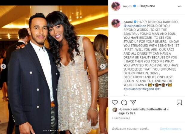 net "С Днём рождения, младший братишка @льюисхэмилтон, горжусь тобой не передавая словами, передо мной красивый молодой человек с красивой душой, который достиг всех поставленных целей, ты-олицетворение того, что все желания становятся реальностью. Возвращаясь к тому моменту когда ты говорил мне, чего ты хотел бы достичь, ты достиг всего и даже больше. Ты - олицетворяешь решительность, драйв, преданность! И это все только начало, достигай больше и надевай свою корону!", - написала она. На одном из снимков супермодель, одетая в короткое платье цвета айвори с глубоким вырезом на груди, тесно прижалась к Льюиса. На втором фото она также позирует в обнимку с гонщиком в полупрозрачном обтягивающем платье с провокационным вырезом на ноге, а также с глубоким декольте. Надо сказать, что несмотря на возраст супермодель имеет роскошную фигуру с безупречными формами. Как сообщалось до этого, британская супермодель Наоми Кэмпбелл впечатлила поклонников безупречными формами в мини-платье «Если вы не против называть всех, кого любите, моими пантерами, вам это нравится?» - говорится в сообщении. На фотографии Наоми Кэмпбелл позирует, эффектно развалившись на кровати с бутылкой напитка в руке. При этом руки знаменитость соблазнительно облизывает, поглядывая в камеру. Напомним, безупречная Наоми Кэмпбелл без лифчика посветила "добром" А еще Politeka писала, что Наоми Кэмпбелл совсем без одежды и стыда показала тело богини. Также Politeka сообщала, что Наоми Кэмпбелл растаяла в объятиях молодой суперзвезды.