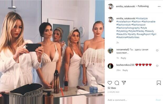 Так на одном из снимков красотка запечатлена вместе с другими моделями в гримерке. Судя по всему, одна из моделей сделала селфи в зеркале, пока остальные готовились к показу. Эмили Ратаковски предстала перед поклонниками в белом платье с максимально рискованным декольте, кажется, что ее грудь готова выскочить наружу от любого неосторожного движения. При этом наряд держится на тонких бретельках, а под ним нет бюстгальтера. На другом фото Эмили Ратаковски позирует на яхте спиной к камере в ярко-красном купальнике, зеркальных очках от солнца и золотых сережках. Модель демонстративно подтянула трусики, а натянувшаяся ткань подчеркнула ее ягодицы, так что сразу все видно: и округлости, и изгибы. Вдобавок, девушка томно обернулась через плечо и улыбнулась. Ранее в сети появилось фото Ратаковски на одном из мероприятий, куда она пришла в персиковом платье с длинным декольте, в котором грудь смотрится просто восхитительно. Ко всему прочему, модель не надела бюстгальтер и придала кадру еще большей пикантности. Тонкая ткань плотно обтянула аппетитное тело красотки и натянулась на больших прелестях. Напомним, лохматая Эмили Ратаковски ошеломила переменами во внешности, стала еще красивее. Также Politeka писала, что Ратаковски разделась и без стеснения показала, чем ее наградила природа. Как Politeka сообщала, что Ратаковски без лифчика повеселилась перед зеркалом в томной позе
