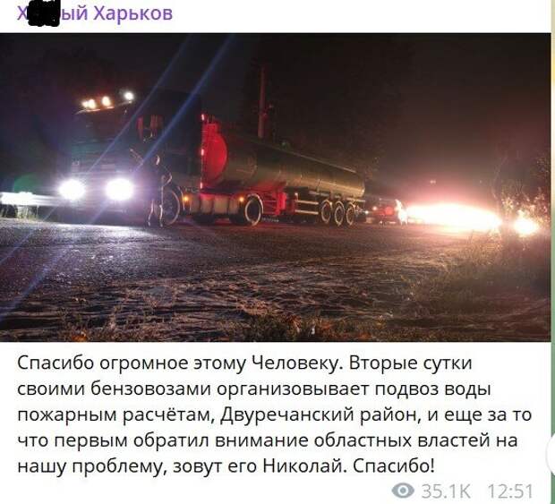 Двое суток мужчина своими бензовозами организовывал подвоз воды пожарным расчётам в Двуречанском районе для ликвидации пожара Кроме того, харьковчанин по имени Николай первым обратил внимание областных властей на нашу проблему. Об этом сообщил теленграм-канал "ХК". "Спасибо огромное этому Человеку.
