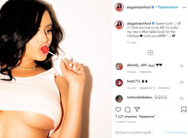 Также Эбигейл сделала себе красивую укладку с легкими кудрями и яркий макияж с длинными накладными ресницами. "Сладкоежка ;) нажмите на ссылку в моем био, чтобы заказать мою новую книгу для журнальных столиков на праздники. Люблю вас всех!" - написала она в подписи к фото. В комментариях фолловеры традиционно восхищаются красотой и сексуальностью модели. "Слишком мило", "Люблю тебя", "Ты хороша в этом", "Эти губы!!!", "Милая!", "Горячая детка", "Шикарная", - пишут в комментариях. Ранее сообщалось, что американская модель Эбигейл Рэтчфорд устроила фотосессию без лифчика. На этот раз соблазнительница поразила шикарными объемами в одних трусиках. Модель игриво показывала свои формы на фото. "Безумная брюнетка" сделала два коллажа с фотографиями, где она показывает большие размеры в разных позах. Напомним, что Эби Рэтчфорд обтянулась Красной сеточкой и превратилась в настоящую госпожу: "безграничное искушение". А еще Politeka писала, что бесстыжая Эби Рэтчфорд показала преимущества в вызывающей позе:"дикая кошечка". Также Politeka сообщала, что Эби Рэтчфорд посветила ягодицами в" хищном "боди:"детка, наклоняйся".