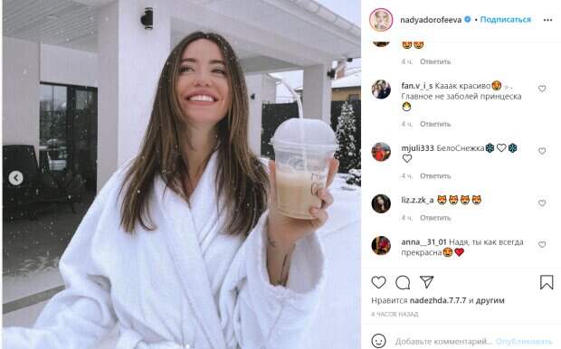 На фотографиях Надя Дорофеева стоит во дворе своего дома в одном халатике, под которым не было практически никакой одежды. Звезда была очарована красотой зимнего дня и мягко падающим с неба снегом, который она ловила ладонями, радуясь каждой снежинке. Певица, увлеченная зимним волшебством, даже забыла о своем кофе, который держала в руке, и принялась бродить по свежему снегу в надетых на босую ногу зимних сапогах. Скорее всего, Надю Дорофееву снял на камеру ее муж Владимир Дантес, которого, вероятно, очаровала хрупкая и манящая фигурка супруги в халатике и неожиданная радость, которая читалась на лице певицы. К тому же Дорофеева не забыла сверкнуть стройными ножками, пока веселилась в снегу. Посмотреть эту публикацию в Instagram Публикация от DOROFEEVA (@nadyadorofeeva) Вид улыбающейся Дорофеевой на фоне снега привел в восторг ее фанатов, которые тут же засыпали ее комплиментами в комментариях, отмечая красоту звезды и переживая о том, чтобы она не заболела. "Надя, замёрзнешь", " Снег и Надя - отличное сочетание!", "Красота", " Волшебно", "Как красиво", "В халате не холодно?", "Бегом в дом, холодно", "Атмосферные фотки", "В очередной раз убеждаюсь, что ты самая красивая девушка в Украине", " Не мерзни! !!!", "Это не снег красивый на фоне Нади, это Надя красивая на фоне снега", "Снежная королева", "Главное не заболей, принцесска", "Какая снегурочка, с лате", "Я думаю, эта женщина сумасшедшая",- пишут поклонники Нади Дорофеевой. Напомним, Дорофеева посветила идеальной фигуркой в бикини и без одежды, показав самые жаркие кадры с отдыха: "Было странно..." Как сообщала Politeka, Дорофеева без штанов устроила урок соблазна, провокационные кадры: "Ох, какая..." Также Politeka писала, что Дорофеева в мини-топе и лосинах устроила бесконтрольный соблазн перед зеркалом: "Хорошо нагибаетесь"
