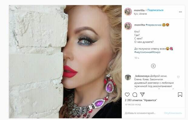 "Кто, где, с кем, о чем думаете? До полуночи отвечу всем", - написала Монро. Фанаты поставили более 2 тысяч лайков и написали комментарии: "Анна, 38 лет, вчера исполнилось, лежу на диване, копыт не чувствую))), пили, ели, танцевали! Компания и день провела отлично", "Смотрю на вас и думаю как можно быть такой красивой??? Всегда!!!!!", "Какая Вы красивая. Роскошная даже точнее", "Яна, 29) помогаю подруги убираться, она ленивая жопа, 3 часа потратили на то чтобы уложить детей спать, думаем закончить на этом уборку", "Ольга, Чехия. Пытаюсь уложить спать дочь, и мучают мысли " все ли я правильно сделала, правильно ли поступила....". Сообщалось, что 42-летняя травести-дива Монро покорила публику не только талантом в готовке, но и пикантными секретами "между девочками говоря". Во время процесса эпатажная звезда затронула щепетильную тему отношений между мужчинами и женщинами, дав несколько советов благодарным поклонникам. Напомним, травести-дива Монро взбудоражила новым образом и эффектными позам Также Politeka писала, что травести-дива Монро взбудоражила публику соблазнительной позой А еще Politeka сообщала, что травести-дива Монро довела до безумия образом в соблазнительном платье
