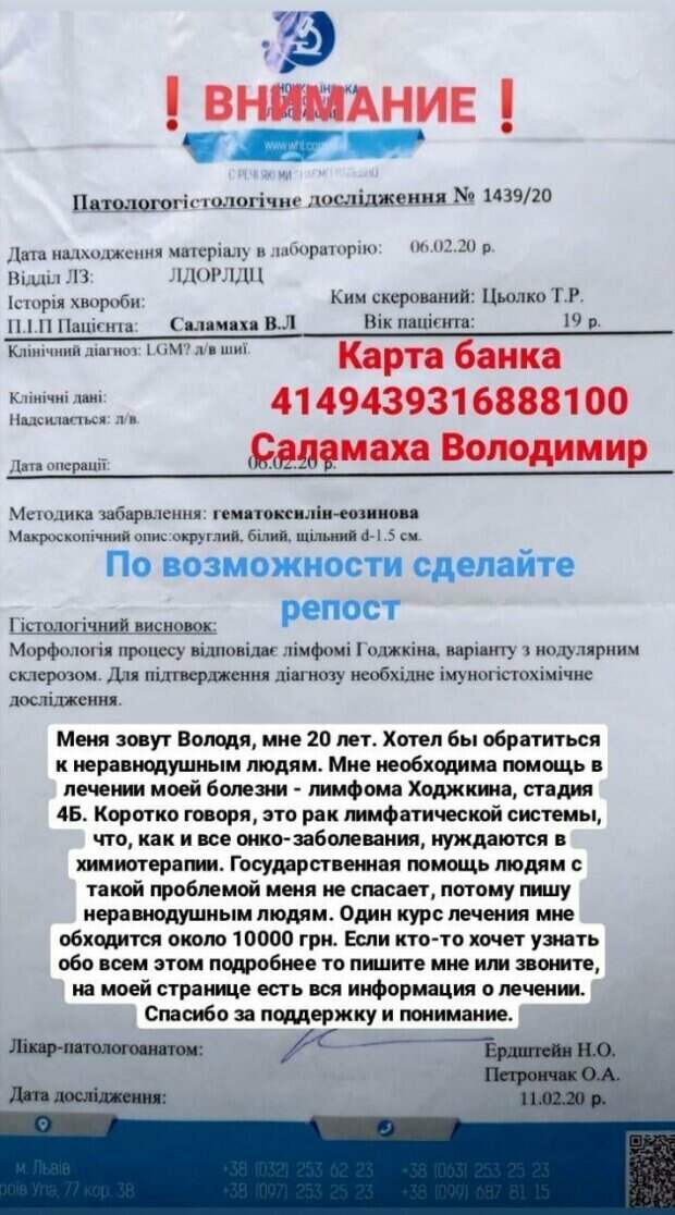 20-летнему украинцу требуется срочная помощь для лечения лимфомы Ходжкина, стадия 4Б Об этом сообщили в Телеграм-канале "Kharkiv Journal". Парню нужно пройти 6 курсов химиотерапии, уже пройдено 4. За каждый курс Володимир отдает по 10 тысяч гривен. "Меня зовут Володя, мне 20 лет. Хочу обратиться к неравнодушным людям: мне нужна финансовая помощь для лечения моей болезни - Лимфома Ходжкина, стадия 4Б.