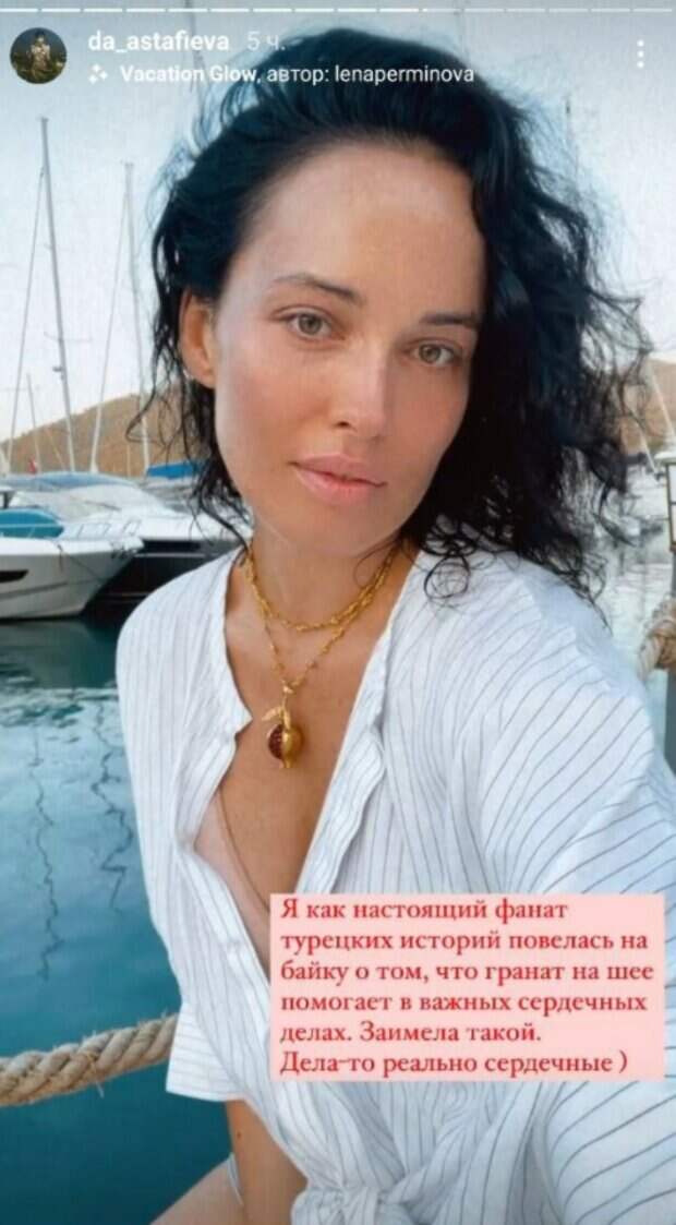 Недавно артистка прогулялась на причале и показала новый сувенир, который якобы должен помочь ей в любовных делах. «Я как настоящий фанат турецких историй повелась на байку о том, что гранат на шее помогает в важных сердечных делах. Заимела такой. Дело-то реально сердечные» - с долей юмора подметила Даша и показала свой новый кулон-украшение. Также артистка поделилась новой серией фото на своей странице в Инстаграм. На снимках Даша в экстравагантном колье позирует на камеру. На ней минимальное количество макияжа, что подчеркивает её натуральную красоту. "То, что ты ищешь тоже ищет тебя.Фраза из книги, которую я читаю. Мои новые истории объясняют то, что съедая тебя изнутри, сделало уже многоэтажки вопросов без ответов…", подписала публикацию артистка. Напомним, Астафьева в наряде из серебристых цепочек показала, как выглядит чувственность. Как сообщала Politeka, Астафьеву на отдыхе неожиданно раздели, показав декольте крупным планом. Также Politeka писала, что Астафьева в леопардовом купальнике неожиданно заговорила об опасностях на отдыхе.