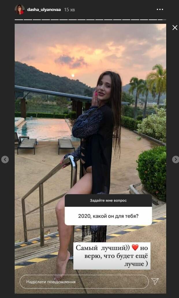 "2020, какой он для тебя?", - задал вопрос поклонник Даше. "Самый лучший. Но верю, что будет еще лучше", - написала в ответе Ульянова. Фанаты не ставили лайки и не писали комментарии, но так и хочется добавить: "Выглядишь совершенно". Сообщалось, что победительница "Холостяка-10" с Максом Михайлюком, Даша Ульянова, похвасталась красотой на откровенном фото. Ульянова ответила на вопросы впечатляющими кадрами. Так, гимнастка вышла на балкон и держась за ограждение, показала растяжку, которой позавидует и балерина Анастасия Волочкова, которая очень любит хвастаться своими шпагатами при любом удобном и неудобном случае. Мы писали, что финалистка 10-го сезона "Холостяка" с Максом Михайлюком Дана Оханская ошеломила фотосессией в стиле ню. Раздетая и мокрая Дана стояла повернувшись к камере боком, подставив стройное тело под мощную струю воды. Девушка небрежно прикрыла рукой выпирающие округлости, немного засветив лишнее. Напомним, кокетливая Ульянова из "Холостяка" в коже дала волю страсти, жаркие кадры А еще Politeka сообщала, что Ульянова из "Холостяка" после болезни ошеломила видом в кожаных шортиках Также Politeka писала, что Ульянова из "Холостяка" засветила ногу от бедра в разорванных штанах