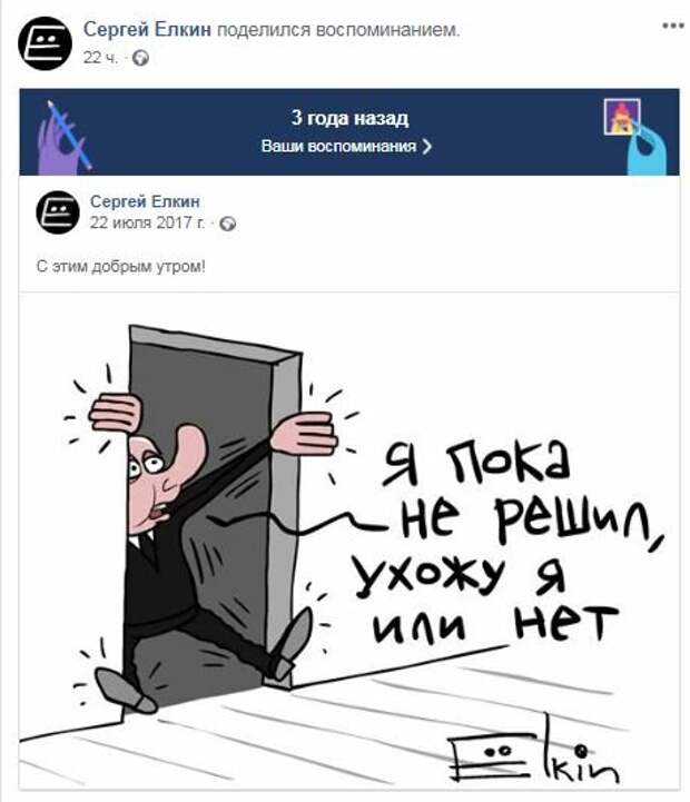 На фотожабе можно увидеть Владимира Путина, который не желает уходить в отставку, и всеми силами держится руками за дверной проем в своем, видимо, личном кабинете. "Я пока не решил, ухожу я или нет", - говорится в подписи к фотожабе. Пользователи с юмором отреагировали на шедевр Елкина и предположили, что Владимира Путина скорее вынесут из Кремля. "Среди России современной, докучней всех других хрычей, сидит воистину бессменный кащей", "Картинку нужно повернуть на 90 градусов против часовой", "Прошли годы...", "Та лучше вперёд ногами...", "Стабильность", "Кто бы подтолкнул", "Вынесут, точнее вынесем", "Когда-нибудь уже эта карикатура станет неактуальной?!", "Жаль только жить в это время чудесное...", - шутят россияне в комментариях. Ранее мы рассказывали, как приезд Путина в Украину обернулся позором. Как известно, 20 июля Владимир Путин прибыл в аннексированную Керчь для "закладки десантных кораблей", но и этот визит надолго запомнится в Кремле. "Владимир Путин приехал в Керчь на закладку новых десантных кораблей", - говорится в подписи к видеоролику, который в своем микроблоге Twitter опубликовал кремлевский пропагандист. Пользователи сразу же высмеяли показуху и фарс, который организовали в оккупированном Крыму ради приезда Путина и предположили, что новыми "десантными катерами" окажутся украденные украинские корабли. Напомним, помолодевший Путин в нелепом наряде довел россиян до слез Как сообщала Politeka, Путин позволил себе лишнего перед камерами, кадры позора повеселили россиян Также Politeka писала, что Путин вышел на связь и довел россиян до слез своим трусливым поступком, фото