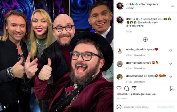 Кадр сделан на съемках самого популярного шоу "Маска". Артисты очень взволнованные и зардевшиеся, снимок вышел очень эмоциональным. Неожиданная популярность шоу, по словам самих звезд, принес участникам и звездным детективам увеличение интереса к знаменитостям среди украинцев. В интервью Оля Полякова заявляла, что успех шоу зависит не только от участников, но и от детективов, которые создают атмосферу фееричности и драйва. В своем посте Михаил Хома он же DZIDZIO написал: "Это невероятное шоу