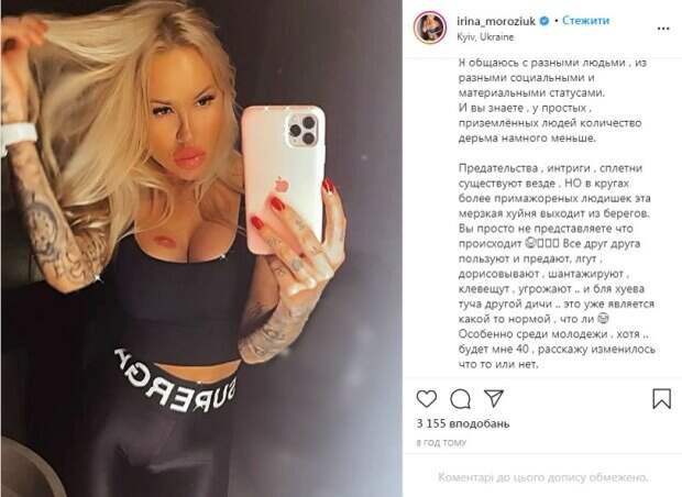Бывшая жена экс-динамовца Николая Морозюка Ирина блеснула формами в тесном топе Об этом пишет Politeka.net со ссылкой на страницу девушки в Инстаграм. Ирина Морозюк решила не только похвастаться пышными формами, но и поделиться рассуждениями о том, как день, а точнее их количество влияет на людей. «Деньги очень портят людей☝Не всех, но большинство.