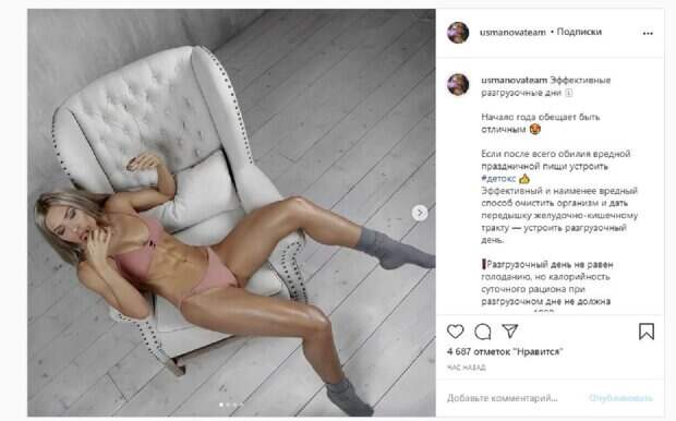 Известная фитнес-модель и тренер Екатерина Усманова показала себя и рассказала о разгрузочных днях На фото Усманова показалась в белье и носочках. Звезда соблазнительно легла на кресло, а в руках держала вкусноту. Девушка закинула одну ногу на подлокотник, хвастаясь подтянутыми ногами и рельефным животиком, который можно заметить выше трусиков.