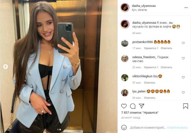 За жизнью длинноногой красотки наблюдают почти 300 тыс. подписчиков в Инстаграм. В своем новом посте Ульянова похвасталась стильным луком, передает Politeka.net. Девушка примерила прозрачную блузу с черным топом, голубой пиджак и кожаные мини-шортики. Традиционно, яркий макияж и распущенные длинные волосы дополнили роскошный образ. Ранее Даша забавляла фанатов яркими снимками из кабины лифта (это уже стало ее фишкой), но в последнее время девушка забросила свое "увлечение". Что подтолкнуло ее взяться за старое, неизвестно, но фанаты в восторге. "Я знаю, вы скучали по фоткам в лифте