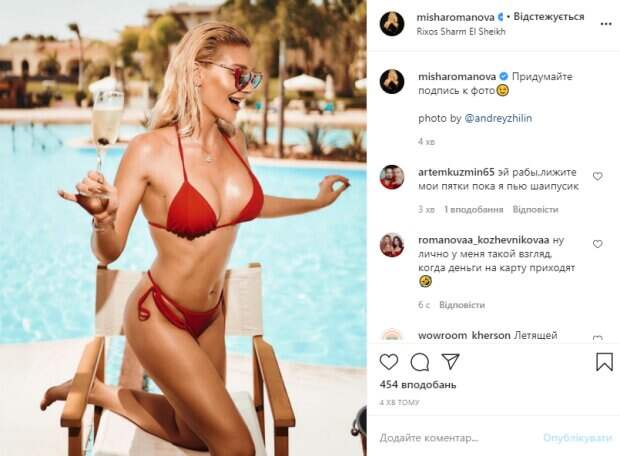Стоит отметить, Мише есть, чем похвастаться, поэтому артистка не упускает случай раздеться перед камерой - зачем скрывать такую красоту? В руках раскрепощенная Миша держала бокал с шампанским. Девушка игриво и немного театрально развела руки и приоткрыла рот. Глаза красотки были спрятаны за стильными солнцезащитными очками. "Придумайте подпись к фото