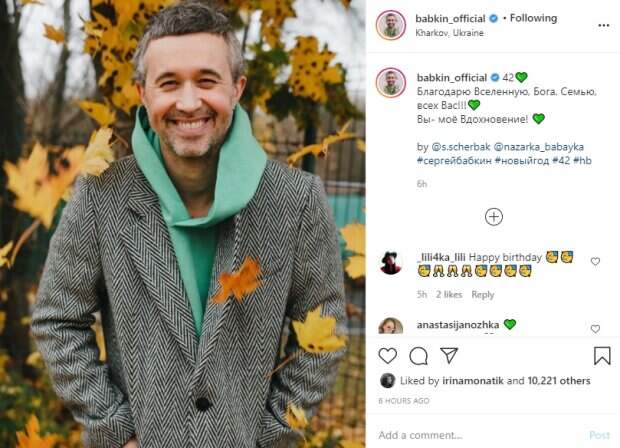 В таком виде Сергей Бабкин сфотографировался на свежем воздухе со счастливым видом - его улыбчивое лицо так и светится от радости. Исполнитель засунул руки в карманы пальто и позволил пожелтевшим листьям свободно падать на его голову и плечи. "42. Благодарю Вселенную, Бога, Семью, всех Вас!!!