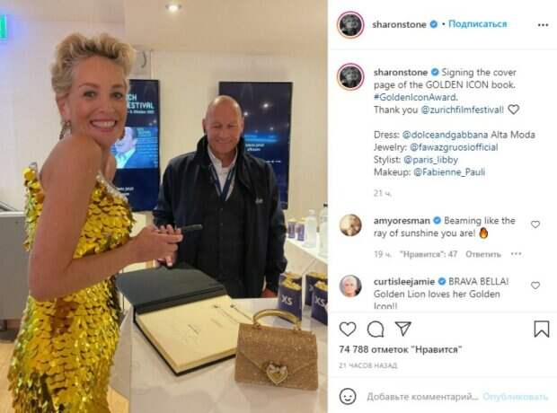 Известная актриса Шэрон Стоун появилась на светском вечере в довольно смелом образе с золотым платьем На церемонии вручения награды ZFF Golden Icon и показе фильма "Казино" актриса появилась в весьма удачном образе. Шэрон блистала на сцене в золотом вечернем платье, расшитом полностью одними пайетками.