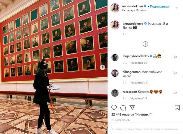 Судя по посту, Седокова и ее дочь выбрались в Эрмитаж. На снимках они прогуливаются по музею, рассматривая экспонаты. При этом и мама и дочь выбрали для выхода полностью черные костюмы. Также на них можно заметить защитные маски. Алина дополнила свой образ стильной черной шапкой и свободными штанами. «Эрмитаж. Я и дочка», - подписала снимки Седокова. Ее поклонники тут же принялись комментировать пост. «Когда не понятно, где мама, где дочка», «Красота то Какая! это самое лучшее ваше фото! Вы тут просто Боги стиля!!», «Такие красивые счастливые а вы с Алиной невероятные!», «Обе красавицы и умницы, приятно наблюдать в таком интересном месте», «Дочка становится красивее мамы, но обе красавицы!», - пишут фанаты звезды. Отметим, что Алина Белькевич – старшая дочь Седоковой от ее первого брака с белорусским футболистом Валентином Белькевичем. Кроме нее звезда воспитывает дочку Монику и сына Гектора. Напомним, Анна Седокова похвасталась, какой красоткой выросла ее 15-летняя дочь, фото: "Такая кошечка". Как сообщала Politeka, томная Седокова прильнула роскошным бюстом к мужу-красавчику, которого отбила у другой: "Это путь личности". Также Politeka писала, что игривая Седокова пошалила в супермаркете и свела с ума хищным образом: "Можно эту пантерку завалить".