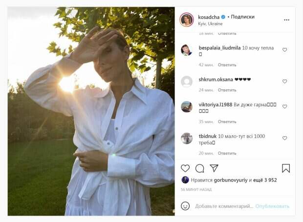 В этот раз артистка предстала в простом образе в белой рубашке и платье. В таком виде модель позировала на закате солнца. "Жду бабье лето.