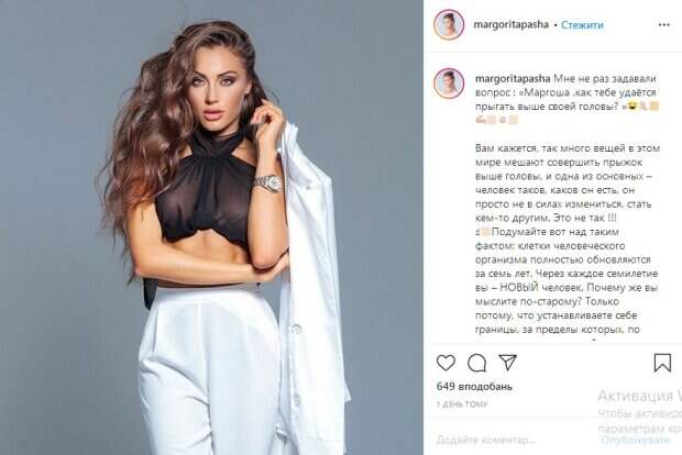 Это не так !!!☝🏻Подумайте вот над таким фактом: клетки человеческого организма полностью обновляются за семь лет. Через каждое семилетие вы – НОВЫЙ человек. Почему же вы мыслите по-старому? Только потому, что устанавливаете себе границы, за пределы которых, по вашему разумению, выйти невозможно», — говорится в сообщении. В то же время модель призналась, что давно поняла простую истину: «достигать амбициозных целей, бежать недостаточно – нужно прыгать». Обратим внимание, что на опубликованной фотографии Паша позирует в белоснежном наряде и прозрачном топе, оголив упругие формы. Это стало причиной бурных комментариев со стороны ее поклонников. «Королевские изгибы», «красотка», «нереальная», «очень красиво», — пишут они. Напомним, скандальная Мисс Украина показала главную гордость в малюсеньком топе А еще Politeka писала, что бесстыжая Мисс Украина в огромном декольте показала, чем ее наградила природа Также Politeka сообщала, что скандальная Мисс Украина выставила напоказ пышные формы прямо в машине