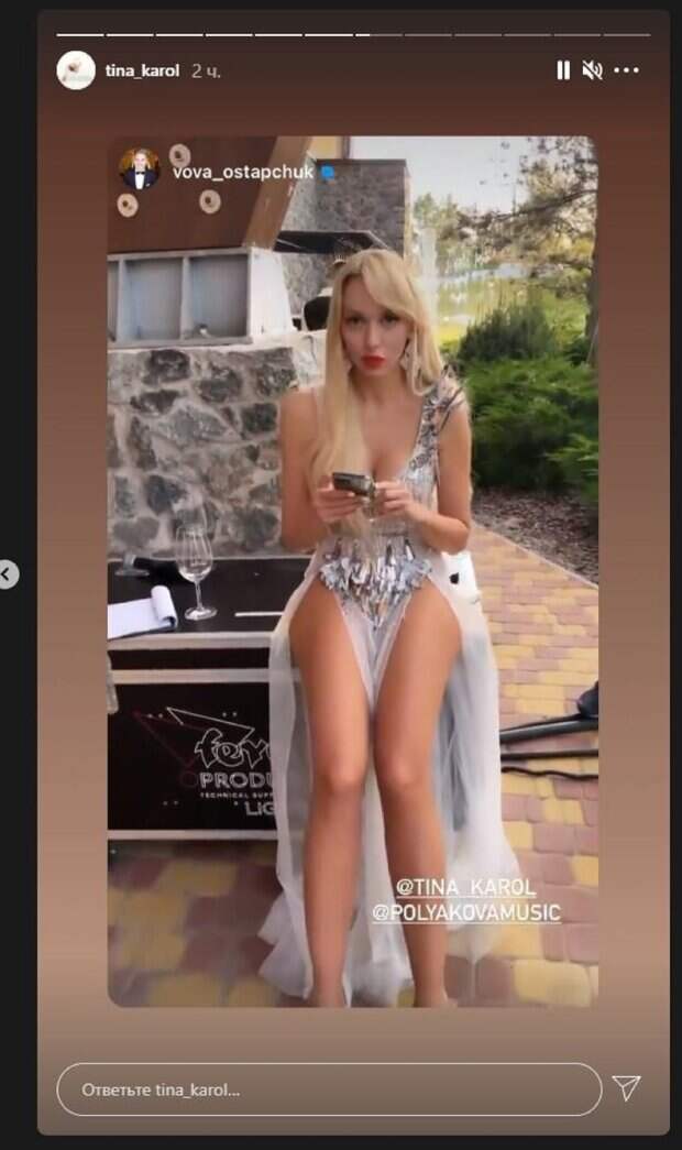 "Олечка, кто это там играет? Твоя любимая артистка, Тина Кароль?", - спросил Владимир Остапчук. "Да, это правда. Ну что, это правда", - ответила улыбчиво Полякова. Оля решила тоже сделать репост видео в свои сторис. Фанаты не ставили лайки и не писали комментарии, ведь ролик был в сторис Инстаграм, где подобных функций не предусмотрено. Отметим, что между Поляковой и Кароль был скандал. На шоу «Маска» Оля назвала Тину «главной плакальщицей на похоронах». Кароль использовала этот выпад в свою сторону для громкой премьеры своего нового клипа «Скандал». Сообщалось, что известная украинская певица Оля Полякова устроила неприличные танцы в гримерке. У себя в Инстаграм красотка опубликовала несколько видео, снятых в гримерке. На первом она сняла себя крупным планом, показав, как ее подготовили к выступлению. На Ольге была традиционная корона и серебристый боди с очень глубоким декольте. Яркий макияж и красные губы приковывали взгляды к выразительному лицу артистки. Напомним, Полякова устроила кокетливый флирт в объятиях Астафьевой А еще Politeka сообщала, что Оля Полякова в одном полотенце неожиданно обратилась к медикам Также Politeka писала, что ведущий "Голосу країни" рискнул выложить неудачные фото Оли Поляковой