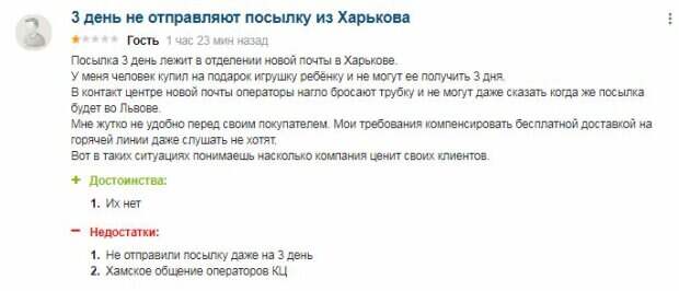 Мне жутко неудобно перед своим покупателем. Мои требования компенсировать бесплатной доставкой на горячей линии даже слушать не хотят. Вот в таких ситуациях понимаешь насколько компания ценит своих клиентов", - рассказал клиент в своем отзыве. Другая клиентка рассказала, что она заказывала три товара из Китая, но Новая почта отдала ей посылку лишь с двумя. Более того, женщина составила претензию из-за посылки, но руководство Новой почты отбросило все обвинения клиентки. "И вот с сентября месяца искали мой товар(?!!) В итоге в декабре выдали резолюцию: в претензии отказать, т.к. к ним пришла такая посылка. А зачем вы такую принимали, вы же несёте полную ответственность за посылку, приняв к перевозке? Воровство обильно процветает и все за счёт клиента", - заявила женщина и добавила, что дальше планирует идти в суд с иском против Новой почты. "Люди, не прощайте воровства. Я тоже подам в суд и такие шустрые будут иметь совершенно другие расходы и ещё больше негатива на всю кампанию", - резюмировала клиентка в своей жалобе. Напомним, сотрудников "Новой почты" заподозрили во вскрытии посылок, пропадает даже валюта Как сообщала Politeka, Операторов "Новой почты" заподозрили в навязывании платных услуг Также Politeka писала, что Новая почта вляпалась в скандал, украинцы жалуются на "наглость" с посылками
