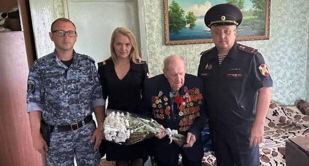 Сотрудники Чеховского отдела подмосковной Росгвардии поздравили с 99-летием ветерана Великой Отечественной войны Александра Хмелевского. Они вручили имениннику цветы, подарки и передали поздравления от руководства территориального органа.