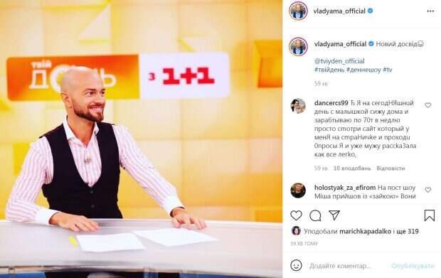 Об этом пишет Politeka.net. Отметим, ведущими проекта «Твій день» помимо Влада Ямы стали Ирина Ванникова, Руслана Писанка, Тимур Мирошниченко, Стася Ровинская, Владимир Рабчун. Каждый четверг к ним также будет присоединяться ведущая Елена Кравец. На новом фото Влад Яма запечатлен в бело-розовой полосатой рубашке, черной жилетке и с широкой улыбкой на лице. "Новый опыт", - которотко подписал фото хореограф. Отметим, среди тех, кто оценил пост оказалась и ведущая 1+1 Маричка Падалко. «Звезда», «Огонь», - отреагировали на фото Ямы его фолловеры. Ранее Влад Яма поделился впечатлениями перед началом новой работы «При всей моей любви к танцам, в моей жизни когда-то все же случится проект, в котором я не буду танцевать. И я не уверен, что это он», - рассказывал Яма журналистам. Напомним, что скандал Ямы и Леси Никитюк, танцор поразил признанием: "Я этого точно не планировал...". Как сообщала Politeka, Влад Яма рассказал, как попал на телевидение после кастинга с Могилевской: «Я без раздумий…». Также Politeka писала, что Влад Яма серьезно обидел Лесю Никитюк и Дмитрия Комарова: "Произошло, то, что...".