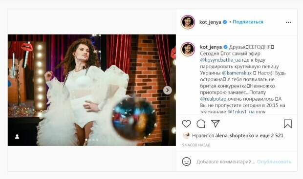 Женя Кот предстал в белоснежном костюме - полупрозрачном гольфе и слишком коротких шортиках. Артист удивил прической - он надел парик из кудрявых и длинных волос, а завершил образ макияж с акцентом на глаза.  Оказывается, Кот спародировал популярную украинскую певицу Настю Каменских.  "Друзья