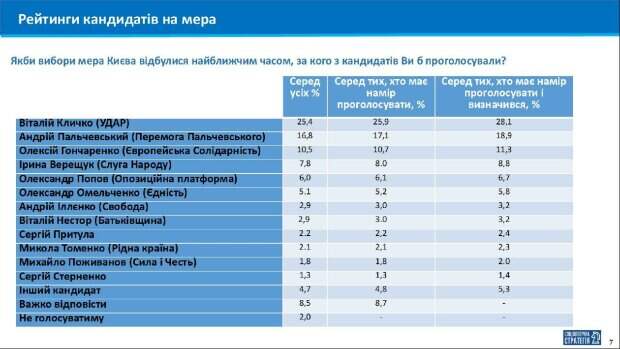 По результатам исследования Виталия Кличко поддерживают 28% жителей столицы, второе место рейтинга занимает Андрей Пальчевский, за которого готовы проголосовать 19% киевлян. Группа "Социологическая стратегия" по заказу политпортала «Говорим Правду"провела исследование электоральных настроений киевлян.