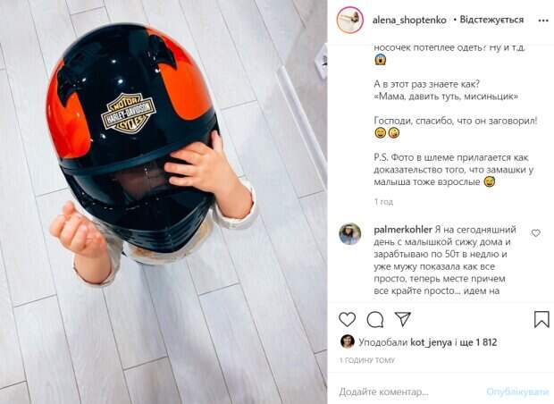 Если точнее, то во время примерки зимних ботинок», - пошутила Шоптенко. Она рассказала, что в 1,4 года было намного тяжелее выбирать малышу обувь. Приходилось много раз примерять одну и ту же пару, чтобы понять, подходит она или нет. «А в этот раз знаете как? «Мама, давить туть, мисиньцик». Господи, спасибо, что он заговорил!», - отметила радостная мама, добавив, что фото в шлеме свидетельствует о том, что замашки у малыша тоже взрослые. За час фото Шоптенко собрало более двух тысяч лайков. В комментариях ей оставили приятные слова. «Счастья огромного Вашему малышу», «Байкер», «Да дети растут быстро. Главное, чтоб рос здоровым и крепеньким», - пишут пользователи сети. Как известно, Алена Шоптенко и Олег Винник были дисквалифицированы из шоу, так как из-за болезни не смогли выйти на паркет две недели подряд. Зрители хотели вернуть пару в проект, но артист отказался, заявив, что это будет несправедливо по отношению к другим участникам. Напомним, что Алена Шоптенко ошеломила видом, расстегнув рубашку: "Минуты выходного дня". Как сообщала Politeka, Алена Шоптенко поделилась своей радостью: "Первый раз в жизни!". Также Politeka писала, что Алена Шоптенко излила душу после вылета из "Танців з зірками": "Жалею только о том, что.