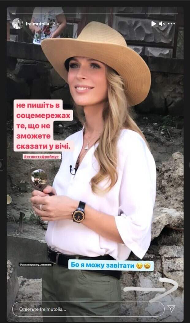На новых сторис Фреймут решила проведать одну из обидчиц, которая написала о ней плохо в сети. "Не пишите в социальных сетях то, что не сможете сказать в глаза. Ибо я могу прийти в гости", - написала Оля. "Хейтеры. I love you. Рубрика в любимом шоу на новом канале, которое почему-то не всем понравилось. Когда я предложила эту идею - идти к хейтерам, все в команде посмеялись. Кроме", - дополнила Фреймут. "Но Анна Жижа смогла воплотить мою бешенную идею. Она тогда была главным редактором программы", - рассказала историю Оля. "Господи, опять эта *** Фреймут", - показала один из комментариев Фреймут, который ее заинтересовал. "Когда думаем о хейтерах, то кажется, люди неадекватные и совращенные. Но, на самом деле, они милые. Просто кидают свой гнев в такой плачевный образ", - дополнила Оля. "Хейтеры, я люблю вас. Запатентовала идею. Возможно, когда-то появится такой формат", - закончила историю Оля. На кадрах Фреймут пришла к девушке, которая оскорбила телеведущую. Хейтерка сказала, что изначально относилась к Оле плохо, но после проекта "пацанки", сменила свое мнение. Напомним, Фреймут с мужем-продюсером показали, что значит быть счастливыми А еще Politeka сообщала, что Ольга Фреймут решила раскрыть украинкам секрет любви к себе Также Politeka писала, что Ольга Фреймут сообщила о новом пополнении и впервые показала малышей