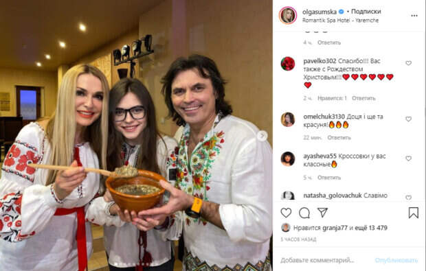 Все трое появились на мероприятии в вышиванках, штанах и кроссовках, удачно сочетая традиции с современной модой. В частности, Ольга дополнила белую сорочку с красным орнаментом черными кожаными брюками и спортивной обувью на объемной рельефной подошве. На одном из кадров все трое держат тарелку с традиционным для праздника блюдом - кутьей. Сумская даже успела зачерпнуть. "