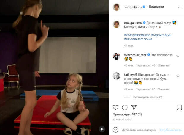 На этот раз на своей странице в Инстаграм Максим Галкин показал новое видео. На кадрах его дочь - Лиза и дочка Кристины Орбакайте - Клава играют сценку. В один момент сын Галкина и Пугачевой - Гарри говорит: "Конец". Девочки ему отвечают, что это еще не конец. "Откуда я знаю когда у вас конец", - крикнул Гарри им в ответ. Поклонники оставили множество приятных слов звездной семье в комментариях: "Шикарные! От куда я знаю когда у вас конец! Суть всего!", "Очаровательные дети! А сколько артистизма. Вот с кого надо брать пример, как воспитывать детей", "Ну, что не говорите, а Лиза вся в маму", "Супер сценка, артистичные какие, это наверное тоже по генам передаётся". Ранее сообщалось, Галкин вывел в свет омолодившуюся Аллу Пугачеву: "Позавидовала Соньке на Новой Волне" Также, пародист Галкин показал, как Пугачева с детьми развлекается пока он на работе: "Восхищаюсь вами..." Politeka рассказывала, Галкин в одних плавках показал, как развлекается без Пугачевой и детей, появилось видео: "Держись там!"