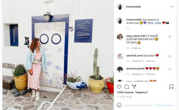 Теперь жена Монатика активно делится снимками из путешествия. Так, на новом фото она позирует возле колоритного белого домика с ярко-синей отделкой. Монатик игриво прислонилась к стене, глядя вдаль. На ней легкий и стильный летний наряд. Для прогулки она выбрала нежно-розовое длинное платье, светло-голубую рубашку, белые кроссовки и розовые очки. Распущенные волосы и легкая улыбка дополнили ее романтичный образ. «Наслаждаться моментом», - подписала снимок Ирина. Ее подписчики тут же принялись комментировать пост. «Красивая», «Такие диковинные места», «Вы прекрасна», «Очаровательна!!!», «Я тащусь от таких эстетических фотографий», - пишут люди. Ранее мы писали, что жена Монатика опубликовала фото, на котором показалась в коротких шортиках и блузе, а на талии можно увидеть бананку. Красотка стояла у дерева, демонстрируя загорелые ножки. Как можно понять по геолокации, девушка отправилась отдыхать в Грецию. "Пожалуйста, с видом на море", - подписала кадр Ирина. Напомним, судья Голосу країни Монатик "уделал" Вакарчука, Дорофееву и Кароль: "Ее Величество Тина...". Как сообщала Politeka, жена судьи "Голосу країни" Монатика в коротких шортах показала свой греческий загар: "Шикарная".