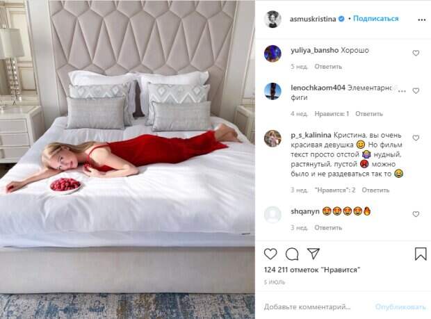 Практически под каждым ее постом пользователи сети осуждают звезду за откровенные фото, дерзкие высказывания или высмеивание своего же поведение. Асмус не реагирует на критику, продолжая делиться фото из спальни, а также кадрами со съемок нового проекта. Не так давно звезда также опубликовала кадр, на котором позировала в постели в одной ярко-красной ночнушке. Причем позировала блондинка рядом с тарелкой вкусной и довольно крупной малины, на которой акцентировала внимание. Поклонники же принялись писать, как актриса тоскует по мужу и ответили на вопрос звезды. «Это беспредел! Почему нет смайлика малины?! Я требую поправок!