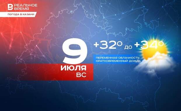 В воскресенье, 9 июля, в Казани ожидается переменная облачность и местами кратковременный дождь или гроза. Такой прогноз дали в Гидрометцентре Татарстана. Днем в Казани воздух прогреется до +32... +34 градусов. В целом по Татарстану ожидается от +31 до +36°С. Синоптики также прогнозируют в Казани южный ветер до 5—10 метров в секунду с кратковременными усилениями при грозе до 15—20 м/с.