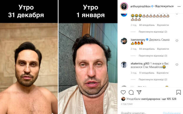 На втором снимке Пирожкова было не узнать. Артист ошарашил заплывшим видом, двойным подбородком. Выглядел он весьма непривлекательно. Чтобы шутка удалась, Ревва подписал фотографии: «31 декабря/1 января». «С Новым годом, Друзья!!! И берегите себя!!! Впереди ещё много выходных», - подписал коллаж комик. В комментариях бурно отреагировали на шутку, оставив массу положительных отзывов. «Держись, Сашка», «Жизненно», «С новым годом!!! Огонь фото, я тоже так проверяю, на что я ещё способна», «Такое ощущение, что кто-то сидел всю ночь на лице», «1 января в Вас вселился Стас Михайлов», - пишут пользователи сети. Ранее мы писали, что Артур Пирожков поднял настроение совместным фото с красавицей-женой. Парочка отдыхает в Дубае, откуда с удовольствием делится теплыми, наполненными любовью фото. На свежем снимке Ревва приобнял Анжелику, позируя возле наряженной елочки. Напомним, что красавица-жена Артура Пирожкова на пляже показала, что доставляет ей удовольствие: «Закат вместе с моей…». Как сообщала Politeka, Артур Пирожков похвастался знойной женой в колпаке Деда Мороза и раскрыл их секрет: «На глазах у прохожих мы…». Также Politeka писала, что горячая жена Пирожкова козырнула загорелыми прелестями рядом с подтянутым мужем: «Ой как круто! ».