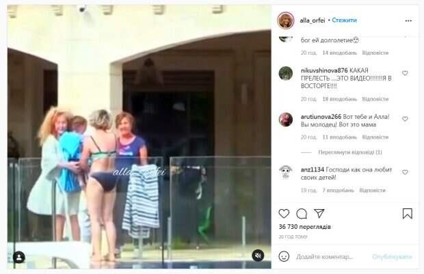 А из-за ветра ее волосы выглядели несколько взлохмаченными. Она подходит к бассейну, где только что поплавал ее сын Гаррии, оборачивает его полотенцем и уносит. В кадр попала и дочка Примадонны - Лиза. В Сети умиляются тем, как Пугачева ведет себя с детьми, и возмущаются работа папарацци. «Мамочка....заботливая, любящая мамочка....», «И что дальше то», «Хорошая она просто Аллочка