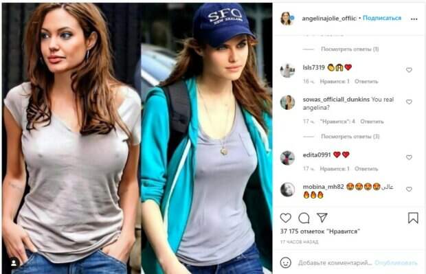 До того, как Джоли провела операцию по удалению груди из-за высоко риска заболевания раком, она часто ходила без лифчика, показывала фигуру в открытых платьях на съемке и в целом нередко удивляла эпатажными появлениями. Как можно заметить, звезду до сих пор сравнивают с молодыми моделями, а также красотками-моделями, которые примерно одного возраста со звездой. На архивном кадре-коллаже две знаменитости показали удачные уличные луки без всего «лишнего». «Есть ли у нее настоящая страница?; Анджелина Джоли - моя королева и ангел