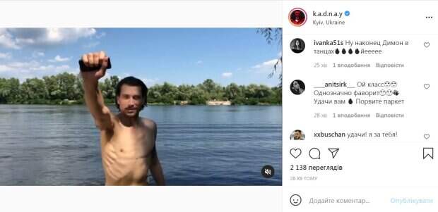 Стало известно имя еще одного участника шоу "Танці з зірками" Так, сейчас проходит #танціззіркамиchallenge, в котором украинские звезды бросают друг другу вызов, приглашая сразиться на главном паркете страны. Очередной вызов принял фронтмен группы KADNAY Дмитрий Каднай. Он выложил на своей странице в Инстаграм юмористическое видео, в котором он бросается в воду вслед за брошенным туда телефоном с сообщением о вызове.