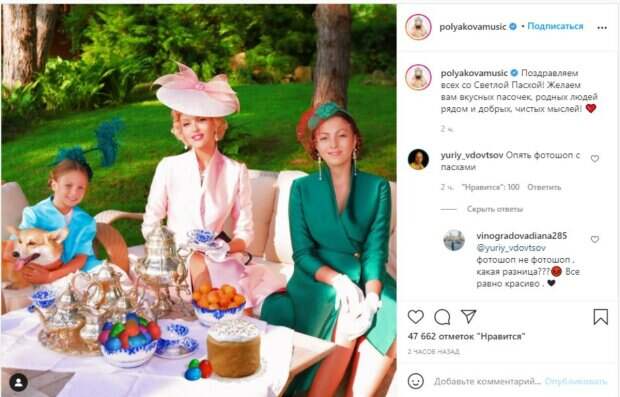 Стильные костюмы подчеркнули образы звезды и детей, а удачная расцветка сделала их более выразительными. Однако, далеко не удачные наряды в этот раз привлекли внимание к себе. Все дело в том, что на светлый праздник Пасхи Оля решила поздравить поклонников, сопроводив свое обращение этим фото. Чтобы сделать его тематическим, звезда прифотошопила на стол куличи и раскрашенные яйца. Именно это в сети и не оценили, удивившись поступку звезды. «Поздравляем всех со Светлой Пасхой! Желаем вам вкусных пасочек, родных людей рядом и добрых, чистых мыслей! ❤️», - написала Оля. Вот что отвечают в сети: Опять фотошоп с пасхами; фотошоп не фотошоп , какая разница???