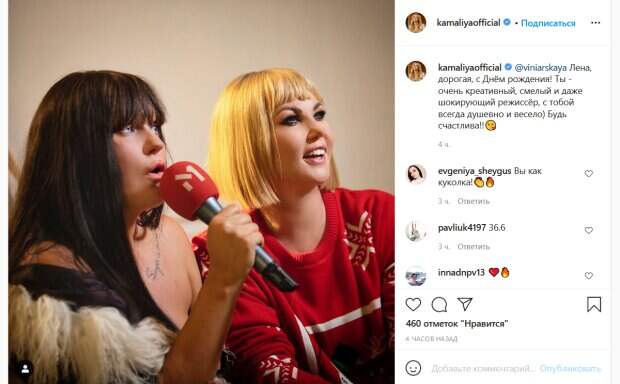«Лена, дорогая, с Днём рождения! Ты - очень креативный, смелый и даже шокирующий режиссёр, с тобой всегда душевно и весело) Будь счастлива!», - написала Камалия, обращаясь к своей подруге. Она также поделилась их общим снимком. При этом, на нем певица появилась в необычном образе. Судя по фото, певица коротко подстригла свои длинные волосы и сделала себе челку. С таким каре она выглядит очень стильно. Дополняет ее образ милый красный свитер. Поклонники певицы тут же откликнулись на ее пост. «Вы как куколка!», «Камалия, вы красавица, молодая девушка», - пишут люди. Ранее Камалия откровенно рассказала, как сбегала от парня, который не хотел отпускать ее в Киев. По словам певицы, она встречалась с парнем, который в один момент стал себя неадекватно вести. Мужчина сказал, что не отпустит ее в Киев, пока она не выйдет за него замуж. Девушка замуж не собиралась, поэтому ей пришлось сбежать от навязчивого ухажера. Побег пришелся на ночь, поэтому Камалии пришлось ночевать на улице. Напомним, самая богатая певица Украины сбежала от возлюбленного, было очень страшно: «Ночевала в кустах…». Как сообщала Politeka, Полякова после скандала с Кароль и Камалией поиздевалась над Остапчуком: "На должность нового коня". Также Politeka писала, что самая богатая певица Украины впечатлила снимком с дочками-близняшками и мужем: "Счастливое семейство".