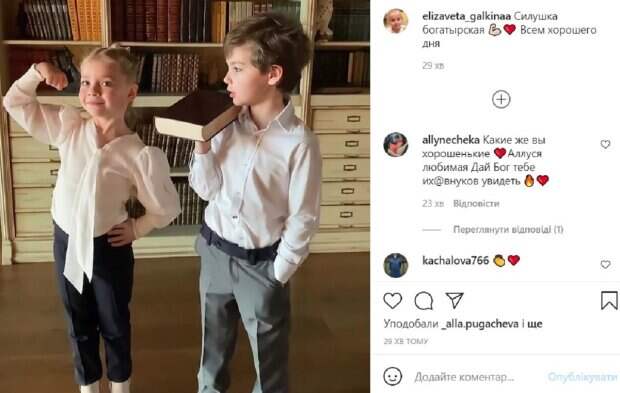 В кадре брат с сестрой стоят на фоне книжных шкафов. В руках Гарри большая книга в твердой обложке. А Лиза согнула руку в локте. "Силушка богатырская" - подписано фото. Дети одеты в школьную форму. На Лизе черные узкие брючки и белая блузка, а на Гарри рубашечка и серые брюки. Девочка, улыбаясь, смотрит в камеру, а Гарри держит книгу одной рукой, а взгляд устремлен на сестру. Свободную руку мальчик засунул в штаны, и что-то говорит своей сестричке. Поклонники от фото пришли в полнейший восторг. В комментариях деток расхвалили и засыпали комплиментами. Фото лайкнула и Алла Борисовна со своего профиля. "Какие они уже взрослые!!! Как быстро летит время!!!", "Какие же вы хорошенькие ❤️Аллуся любимая Дай Бог тебе их внуков увидеть
