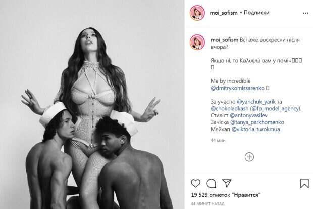 Украинский фотограф и судья проекта "Супер топ-модель по-украински" Соня Плакидюк поделилась пикантным фото в окружении обнаженных мужчин и поинтересовалась самочувствием своих фолловеров после новогодней ночи Об этом сообщает Politeka со ссылкой на страницу Плакидюк в соцсети. Так, в аккаунте Сони появилось черно-белое фото, на котором она позирует в колготках в сеточку и пикантном корсете, а рядом с ней внизу стоят двое мужчин спортивного телосложения.