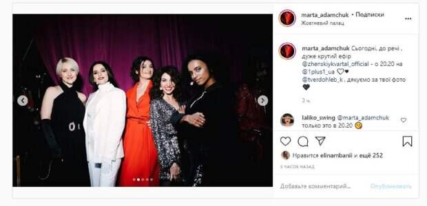 Об этом пишет Politeka.net со ссылкой на страничку знаменитости. "Сегодня, кстати, очень крутой эфир", - подписала фото Марта в социальных сетях. Фанаты поставили несколько сотен лайков и написали комментарии: "Люблю вас четверых", "О, сольный номер, главная роль? Невозможно интересно. До встречи вечером". Сообщалось, что звезда студии «Квартал 95» Марта Адамчук впечатлила стильным образом в шляпе и коже. Марта, которая обычно предпочитает более женственные образы с платьями и роковыми вырезами, на этот раз решила примерить более суровый стиль. Так, для фото артистка выбрала черную кожаную куртку, темный штаны и кофту. Мы писали, что звезда «Женского квартала» и его «золотой» голос Марта Адамчук в очередной раз доказала, что для того, чтобы восхищать, не обязательно раздеваться до трусов и эпатировать откровенными снимками. На ней – черная водолазка и темные широкие брюки, подхваченные ремнем, крой которых подчеркивает тонкую талию артистки. Выглядит Марта, как настоящая королева стиля! Напомним, знойная брюнетка из "Квартал 95" в коже и шляпе ошарашила преображением даже подруг А еще Politeka писала, что жгучая красотка из «Квартал 95» засветилась в объятиях «волосатого» гиганта Также Politeka сообщала, что блондинка из "Квартал 95" дала насладиться своими шикарными формами без белья